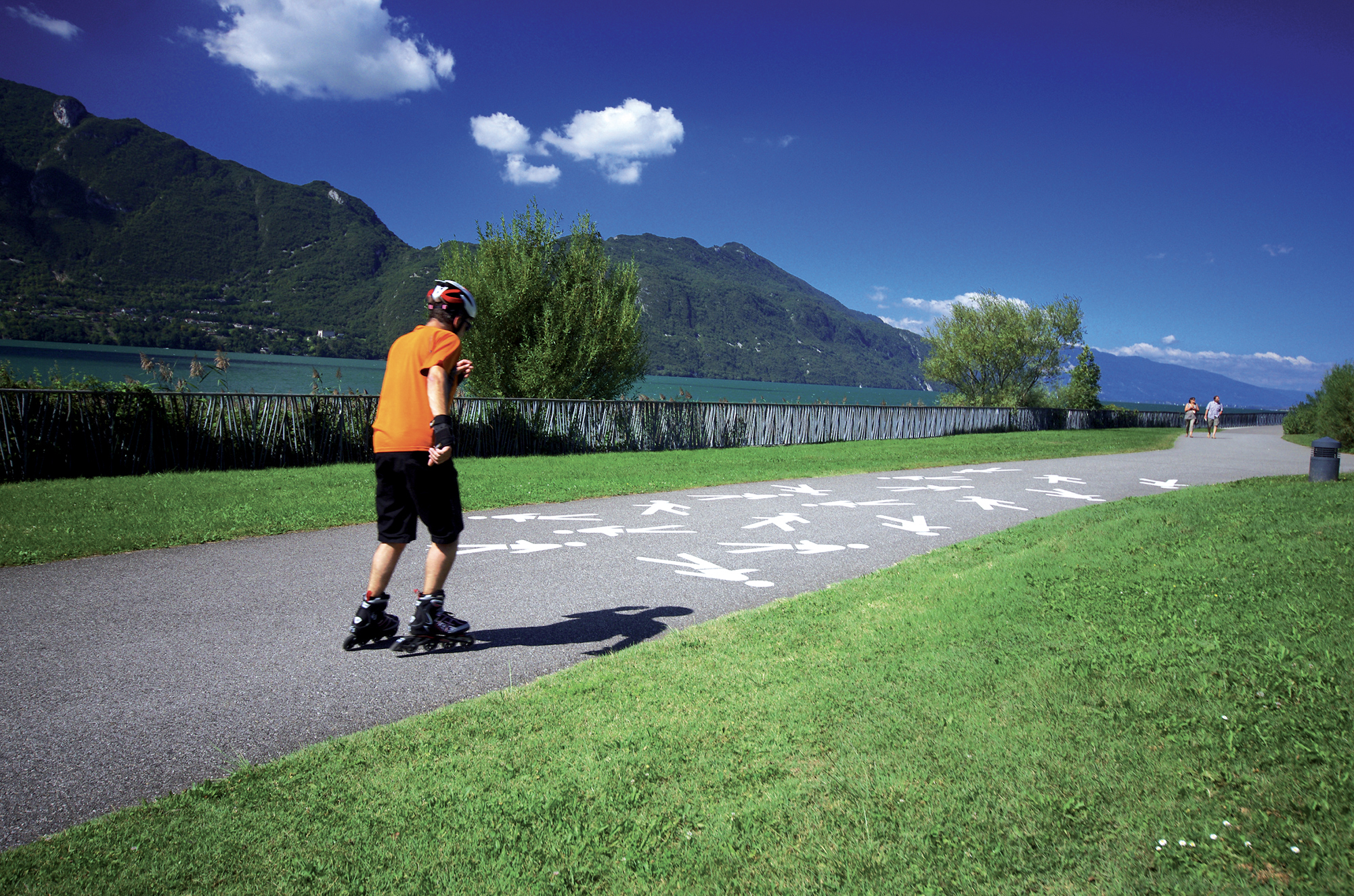 Il fallait également reconquérir les berges pour préserver l’écosystème, améliorer la qualité du paysage et faciliter les accès du public au lac pour les activités de loisirs. D’où la création d’un véritable chemin lacustre sur plus de 3 km “à fleur d’eau” en contrebas de la route, coupé de la circulation routière, et dédié aux modes de déplacements doux : piétons, cyclistes, rollers, personnes à mobilité réduite se sont réapproprié cet espace et ils se déplacent désormais côte à côte en toute sécurité. Les berges ont également été aménagées avec la création d’engraissement en pente douce et la réalisation d’un cap paysager sur le lac à vocation récréative et culturelle. Le « cap des Séselets », réalisé en privilégiant la réutilisation des matériaux extraits de l’ancienne route (11 000 m 3 ) et de matériaux provenant de carrière (30 000 m 3 ), est aujourd’hui en herbe et offre un espace de 7 000 m 2. De nouvelles roselières ont aussi fait leur apparition avec la plantation d’espèces végétales adaptées au milieu naturel sur plus d’un hectare pour protéger la flore et la faune et permettre leur développement.